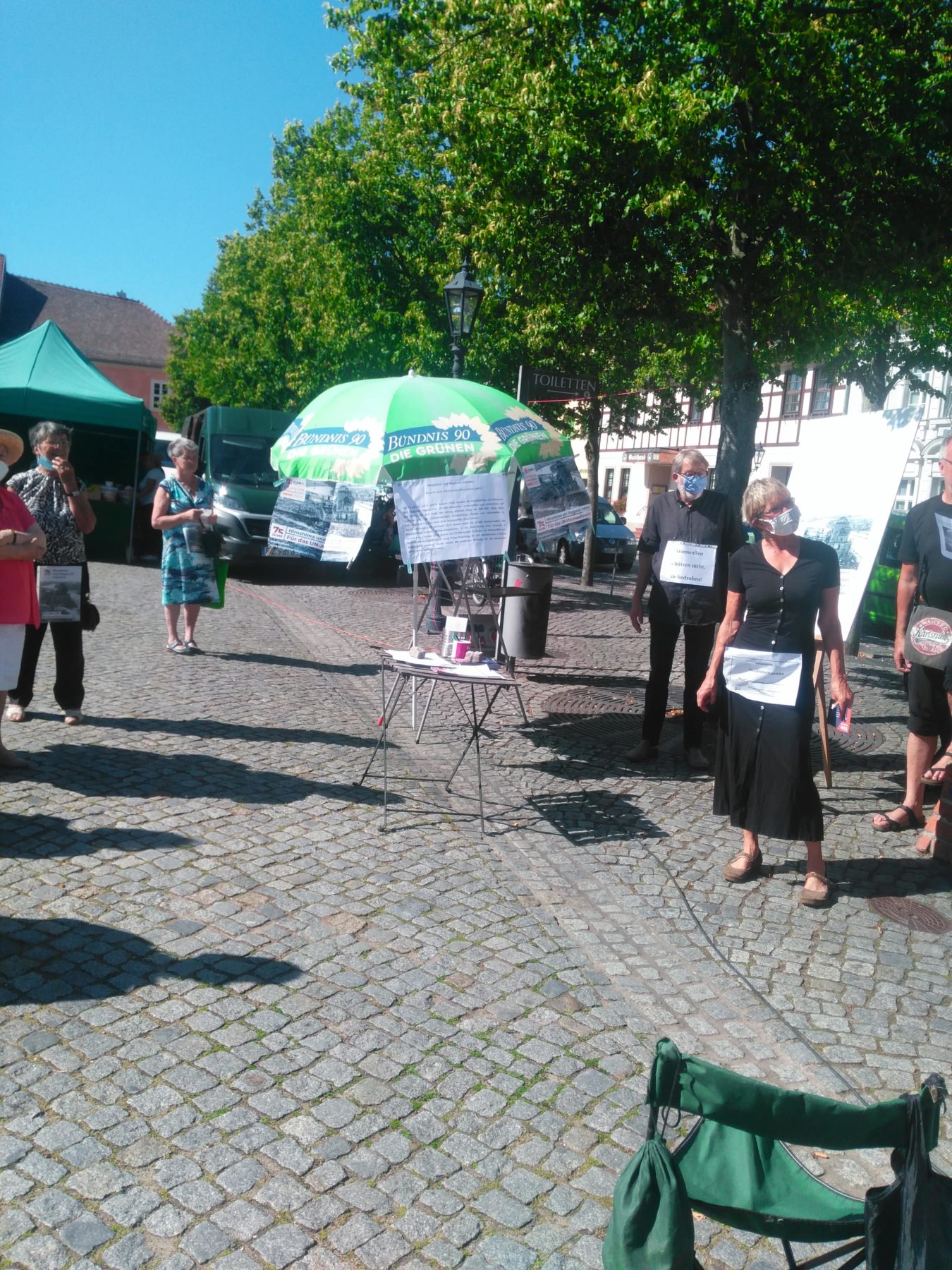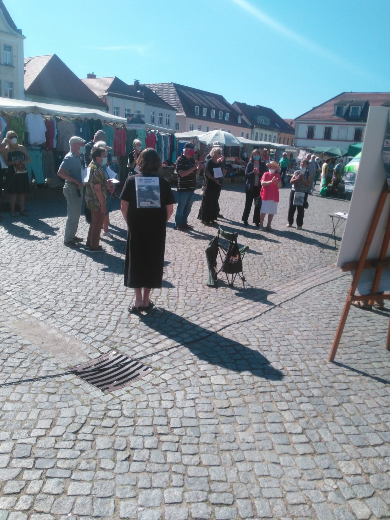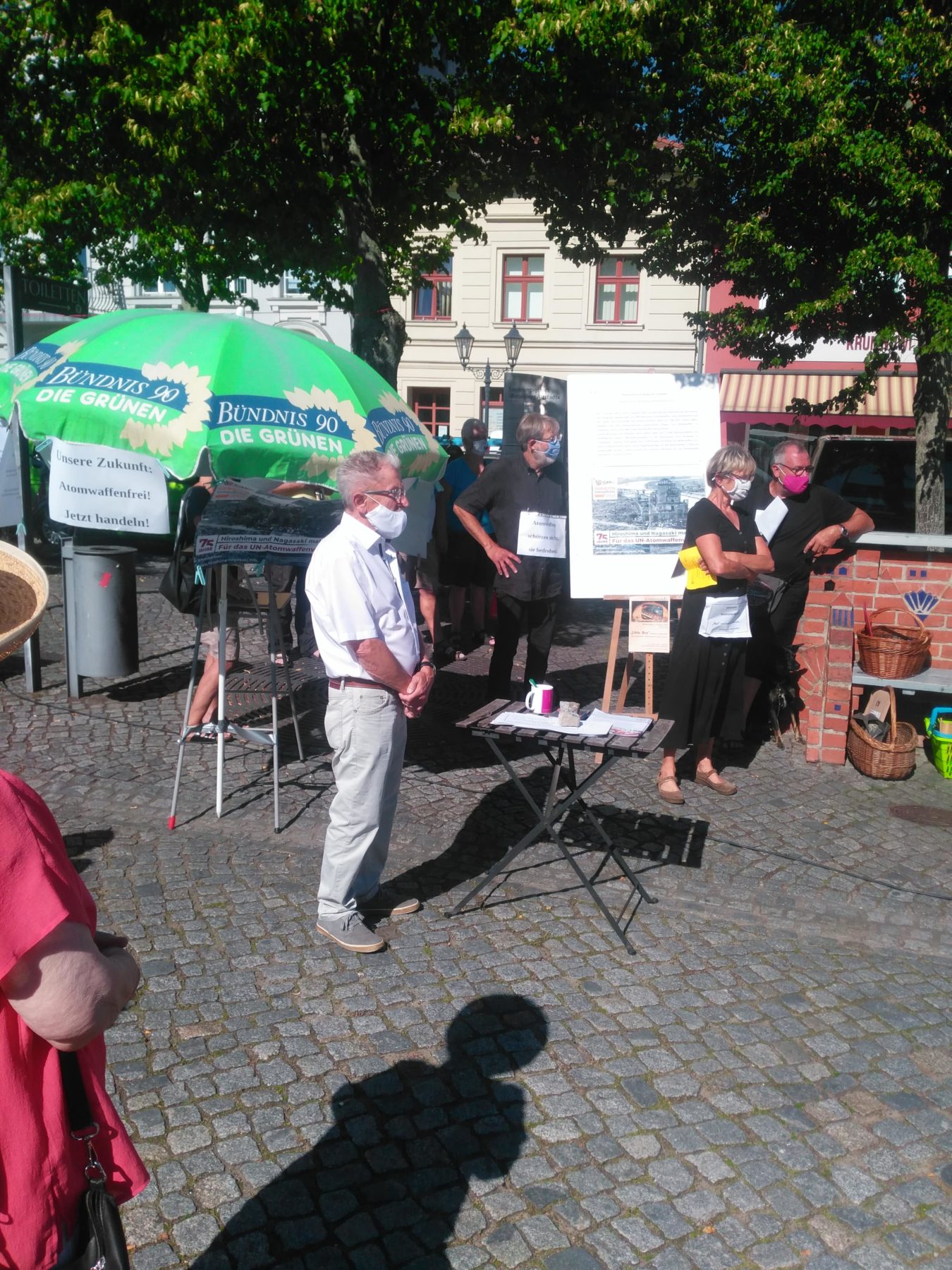 Die am 06. August 2020 in Beeskow durchgeführte Mahnwache, zum Gedenken an den 75. Jahrestag des Abwurfs der Atombombe auf Hiroshima, und die damit verbundene Aufforderung an die Bundesregierung, den Atomwaffenverbotsantrag zu unterschreiben, ist erfreulich gut angenommen worden. Schon zu Beginn der Veranstaltung auf dem Marktplatz hatten sich ca. 30 Besucher unter die in schwarz gekleideten Mitglieder der Regionalgruppe zu einem bunten Bild gemischt. Die Unterschriftenaktion fand große Resonanz und in Gesprächen bekamen wir viel Zustimmung für die Aktion.